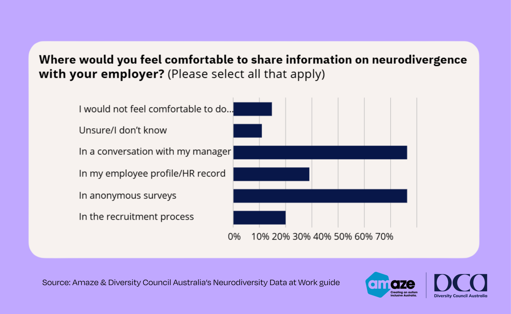 The guide highlights that there is still stigma attached to neurodiversity in Australia. For example, when asked how comfortable they would be in sharing information about neurodivergence with their employer, 15 per cent of employees surveyed said they flat out would not feel comfortable doing so, while another 20 per cent said they would not be comfortable raising neurodiversity in the recruitment process. Most said they would be okay about sharing such information in a one-on-one meeting with their manager or in an anonymous survey.