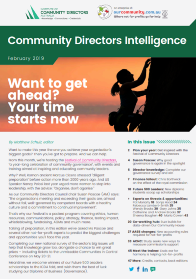 From this month, we’re hosting the Festival of Community Directors, “a year-long celebration of community governance”, with events and training aimed at inspiring and educating community leaders. Why? Well, Roman ancient Marcus Cicero stressed “diligent preparation” before action more than 2000 years ago. And US Speaker Nancy Pelosi last year urged more women to step into leadership, with the advice: “Organise, don't agonise.”